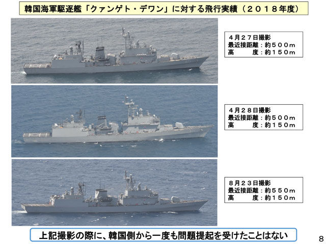 韓国駆逐艦にもっとも接近した際でも、十分な高度(約150m)と距離(約500m)を確保しており、韓国駆逐艦の活動を妨害するような飛行も行っていない」と反論した。